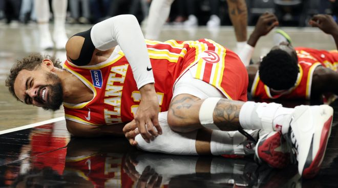 坏消息,杰伦·布朗飞身扑球撞到小琼斯腿后,小琼斯被抬下场